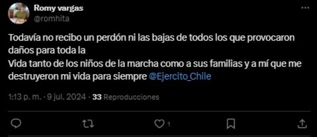 En respuesta a las palabras de Iturriaga, Romy Vargas, madre del fallecido conscripto Franco Vargas, expresó su indignación a través de las redes sociales. “¿Y el perdón para nosotros que sufrimos los horrores? Y las bajas de todos los que lo provocaron? Eso necesito! Que lo diga a nosotros no a la TV”.