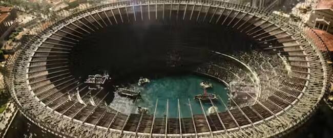 Ya en una escena del tráiler se pudo ver el Coliseo Romano inundado con embarcaciones dentro en una especie de batalla naval, algo que llamó profundamente la atención. Tras la llegada de la cinta pudimos verlo aún más detallado y es bastante sorprendente.