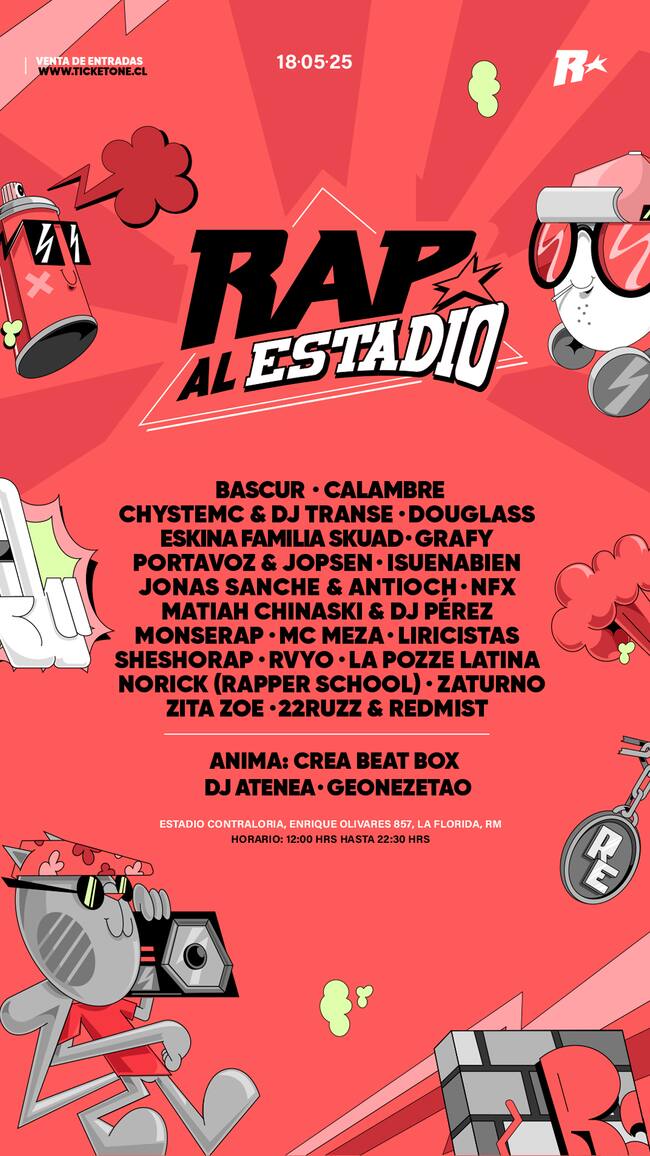 Más de veinte artistas del hip hop nacional se reunirán el domingo 18 de mayo en el Estadio Contraloría de La Florida para dar vida a una jornada histórica: el Festival Rap al Estadio, un evento sin precedentes que celebra casi cuatro décadas del género en Chile.