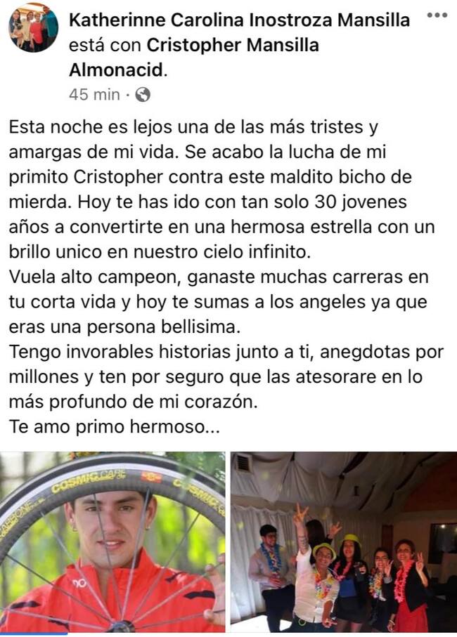 La prima del deportista, Katherine Inostroza Mansilla, mandó un mensaje tras el deceso de su familiar: «Vuela alto campeón, ganaste muchas careras en tu corta vida y hoy te sumas a los ángeles, ya que eres una persona bellísima».