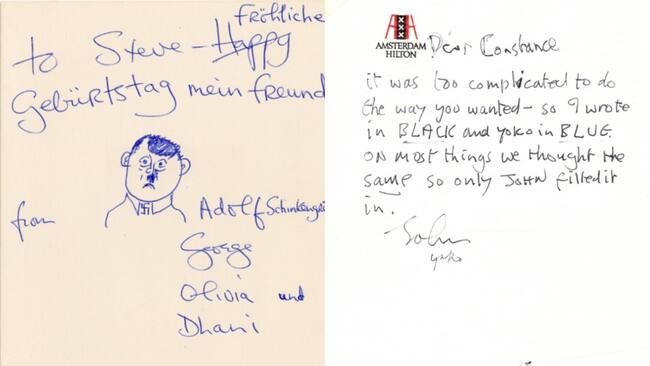 En paralelo, también se vende una tarjeta de cumpleaños que George Harrison envió al cuidador de su casa en Hawái. Parte de lo curioso es que incluye una escritura en alemán y una peculiar caricatura de Adolf Hitler.