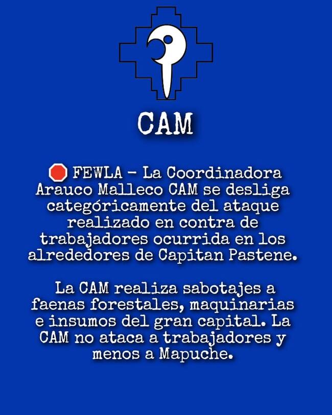 “La CAM realiza sabotajes a faenas forestales, maquinarias e insumos del gran capital. La CAM no ataca a trabajadores y menos Mapuches”, manifestaron.