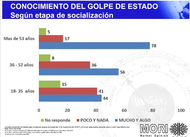 Respecto a los resultados de la encuesta, este demostró que 78% de las personas de más de 53 años, es decir, que vivió la dictadura, afirma saber mucho de este proceso histórico, conocimiento que desciende a 56% en el grupo etario de 36 a 52 años.