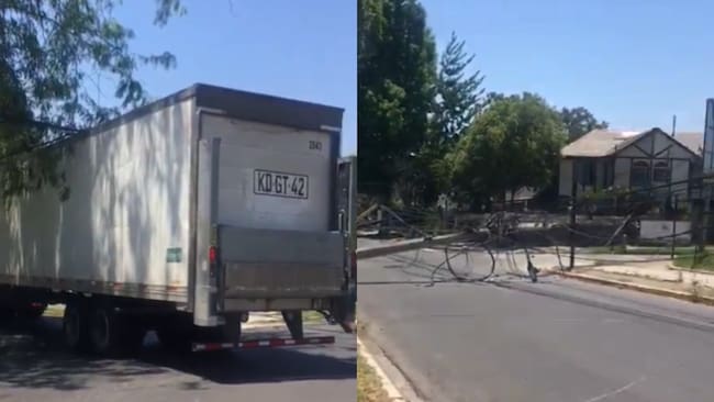 Según informó el municipio, se trata de un camión con acoplado que trasladaba comida refrigerada al supermercado Líder de Isabel la Católica. Sin embargo, al transitar por la calle Alcalde Chadwick arrasó con los cables que estaban a baja altura.