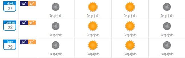 el sábado 27 de enero se registrarán cielos despejados, con un peak de 32°; el domingo 28 de enero el pronóstico apunta a una máxima de 31°, en tanto el lunes el cielo continuará sin nubes, con un clímax de 32°.