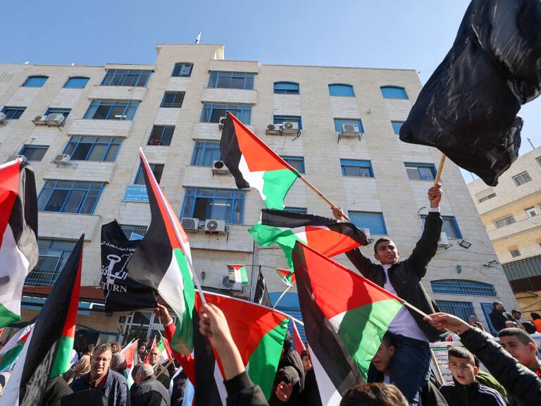 Manifestantes con banderas de Palestina a las afueras de la sede de la UNRWA en la localidad de Ramallah en Cisjordania. / JAAFAR ASHTIYEH