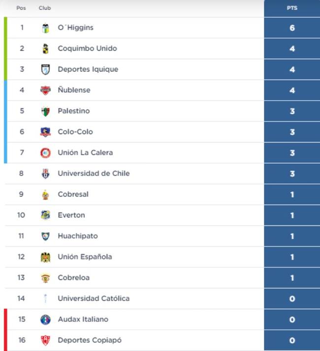 Mientras que en la parte baja se encuentra Universidad Católica, que el viernes hizo su debut en el torneo y sufrió una dura derrota ante Ñublense. Además de los “Cruzados”, Audax y Copiapó también son colistas con cero unidades.