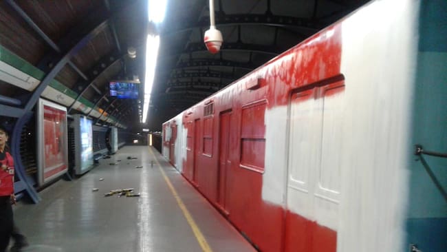 Las cámaras de seguridad del tren subterráneo lograron captar a unos 40 individuos con ropas oscuras y encapuchados, quienes lanzaron pintura a las cámaras, dejándolas fuera de servicio.