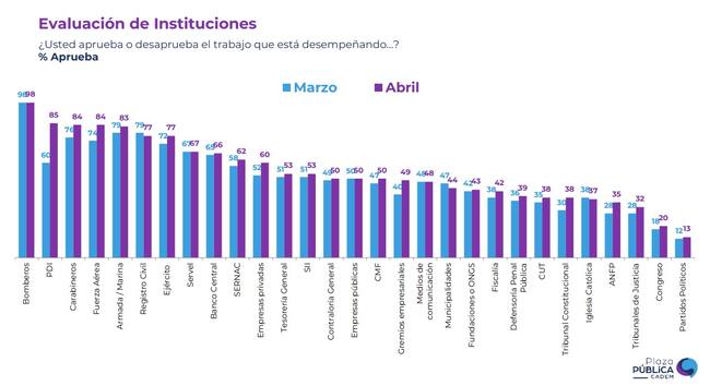 De esta manera, Carabineros ahora ocupa el tercer puesto como la institución mejor evaluada, siendo superada por la PDI que registró un 85% de apoyo y por Bomberos, que tiene 98% de aprobación.