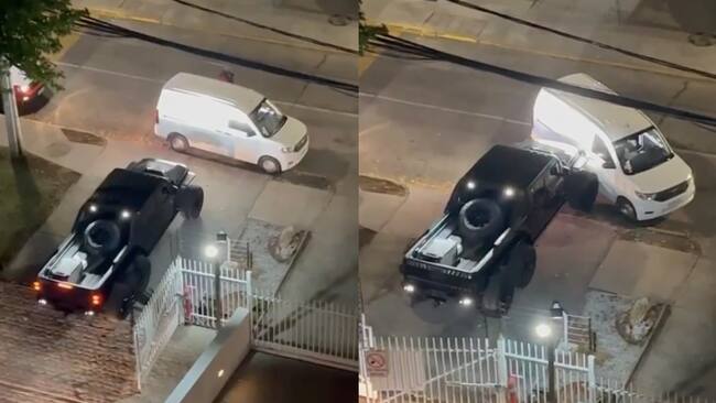 Sin embargo, horas después surgió otro reclamo. Ahora, un inspector municipal estaba solicitando apoyo, ya que el conductor de una camioneta negra que estaba saliendo del recinto chocó el vehículo mal estacionado, cruzándolo hasta la acera de enfrente.