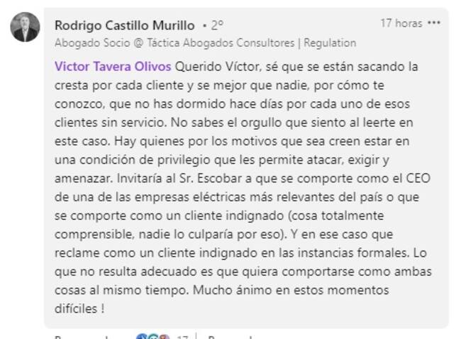 El conflicto atrajo comentarios de otras figuras relevantes del sector eléctrico. Rodrigo Castillo, ex director ejecutivo de la Asociación de Empresas Eléctricas, defendió a Enel y criticó la actitud de la autoridad de Colbún. “Hay quienes creen estar en una condición de privilegio que les permite atacar, exigir y amenazar. Invitaría al Sr. Escobar a que se comporte como el CEO de una de las empresas eléctricas más relevantes del país o como un cliente indignado, pero no como ambas cosas al mismo tiempo”, escribió.