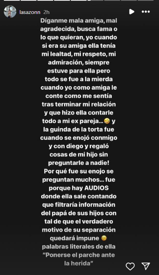 “La guinda de la torta fue cuando se enojó conmigo y con Diego y regaló cosas de mi hijo sin preguntarle a nadie. Por qué fue su enojo se preguntan muchos... fue porque hay AUDIOS donde ella sale contando que filtraría información del papá de sus hijos con tal de que el verdadero motivo de su separación quedará impune, palabras literales de ella: ‘Ponerse el parche ante la herida’”, complementó.