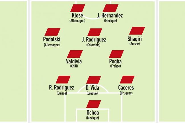 Los otros nombres que acompañan a Jorge Valdivia en este once ideal de L’Equipe son: Guillermo Ochoa (México), Martín Cáceres (Uruguay), Domagoj Vida (Croacia), Ricardo Rodríguez (Suiza), Paul Pogba (Francia), Xherdan Shaqiri (Suiza), James Rodríguez (Colombia); Lucas Podolski (Alemania), Javier Hernández (México) y Miroslav Klose (Alemania).