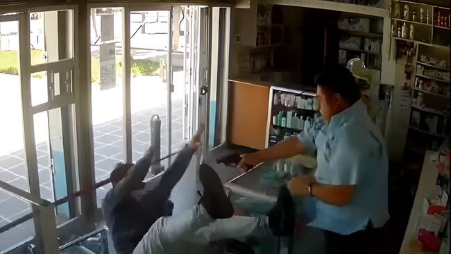 Según registros de seguridad, el individuo ingresó fingiendo ser un cliente y preguntó por un jarabe. Cuando el vendedor se dio la vuelta, el sujeto lo sujetó por la espalda e intentó apuñalarlo. En respuesta, el comerciante sacó un arma de fuego y le disparó varias veces.