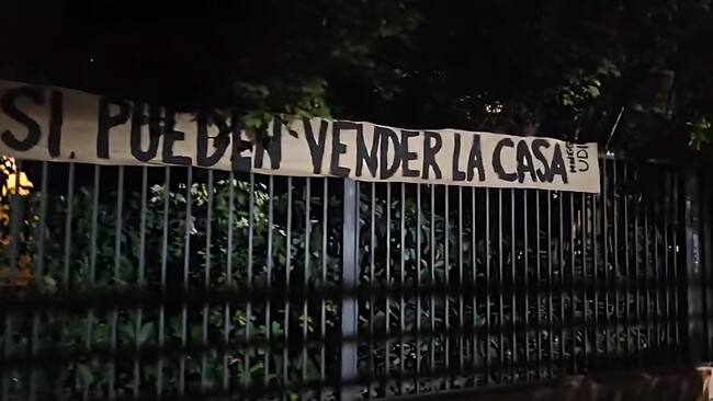 El cartel, con la leyenda “Ahora sí pueden vender la casa”, hace referencia al fallido intento del gobierno del Presidente Gabriel Boric por adquirir la propiedad como homenaje al exmandatario y formar una museo.