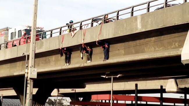 Cuatro manifestantes se colgaron desde un viaducto de la autopista Américo Vespucio, mientras bomberos y Carabineros trabajaban para garantizar su seguridad.