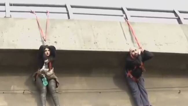 VIDEO. Manifestantes se cuelgan de paso sobre nivel en rotonda Grecia: exigen al Gobierno soluciones habitacionales