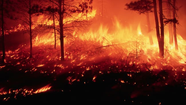 Forest fire burning out of control in a pine forest on the Mescalero Apache Indian Reservation in New Mexico. / Raymond Gehman