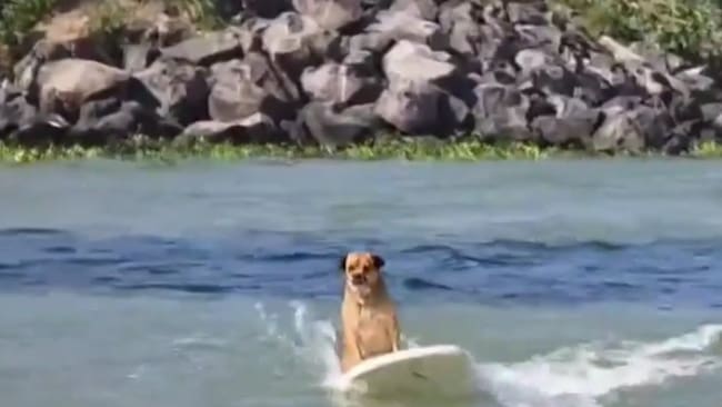 En distintos registros compartidos en redes sociales se observa al perro mantener el equilibrio con seguridad mientras avanza sobre el agua, sin mostrar temor ante el movimiento del mar.