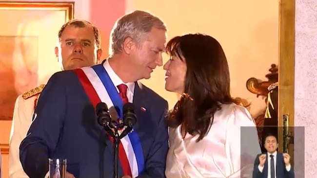 Mientras se dirigía a la multitud reunida en la Plaza de la Constitución durante la jornada del cambio de mando, el público comenzó a corear “¡el beso, el beso!”, pidiendo que el mandatario besara a su esposa, Pía Adriasola, lo que finalmente ocurrió en medio de aplausos y gritos de los asistentes.