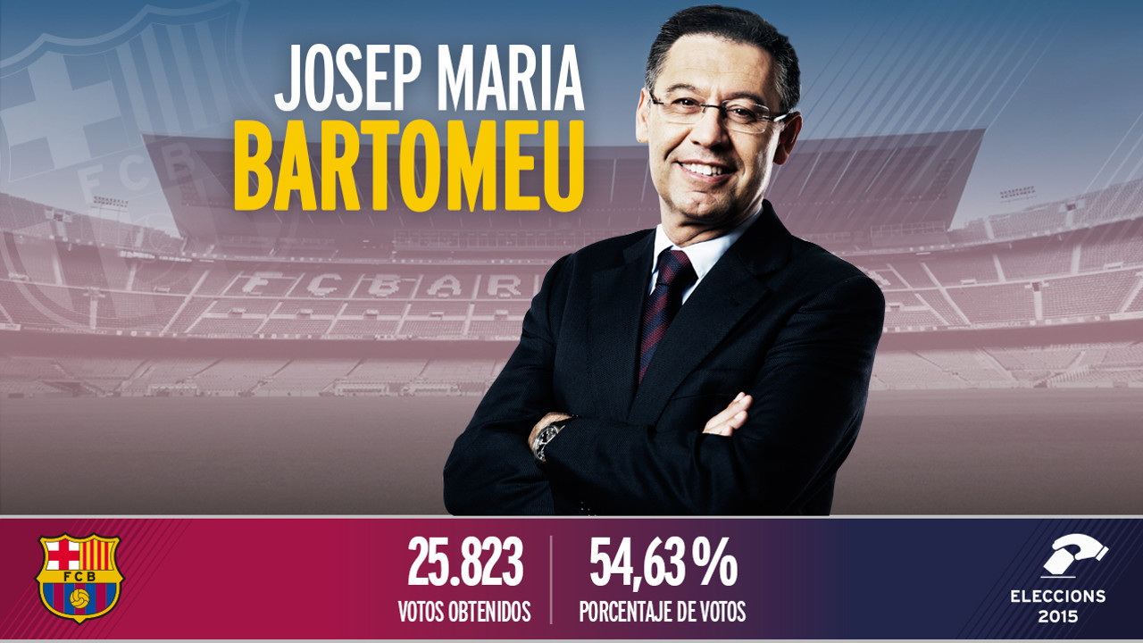 Bartomeu ha recibido 25.823 votos (54,63%), mientras que Joan Laporta ha conseguido el apoyo de 15.615 votos (33,03%). Benedito ha reunido 3.386 (7,16%) y Freixa 1.750 (3,70%). En total votaron 47.270 socios (43,12% del censo), de los cuales 506 votos fueron en blanco y 190 no válidos.