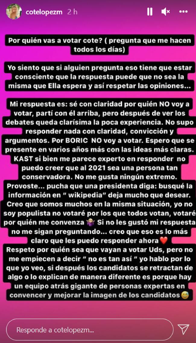 Luego, López compartió otra historia, donde dejó claro que «por Boric no voy a votar», para después analizar a otros postulantes.