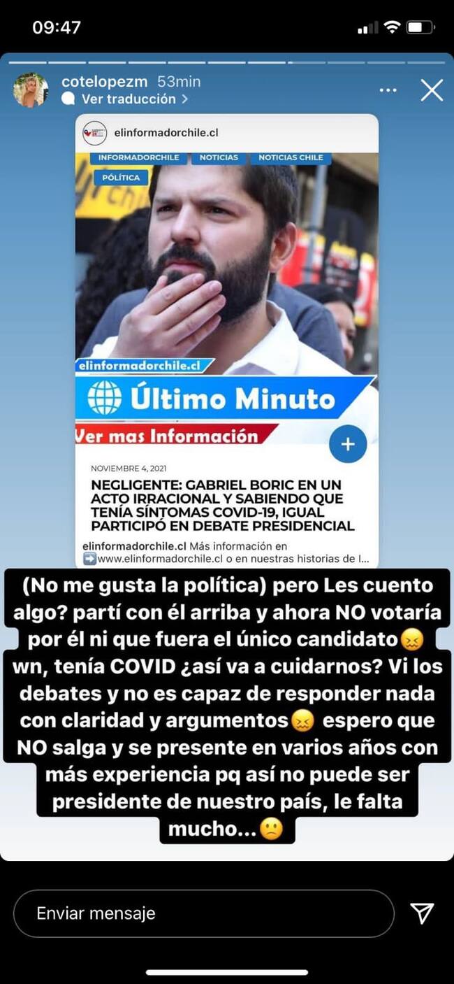 En la primera, la blonda compartió una imagen con la noticia del contagio de Boric, donde expresó que «no me gusta la política, pero ¿les cuento algo? Partí con él arriba y ahora no votaría por él aunque fuera el único candidato».