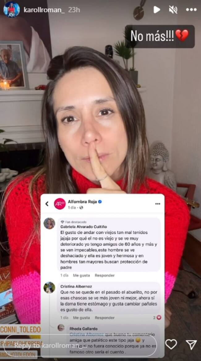 Karoll Román decidió exponer los mensajes que le dedican a su relación con el cantante. "Comentarios crueles hacia mi persona y de forma gratuita, sin conocerme", denunció.