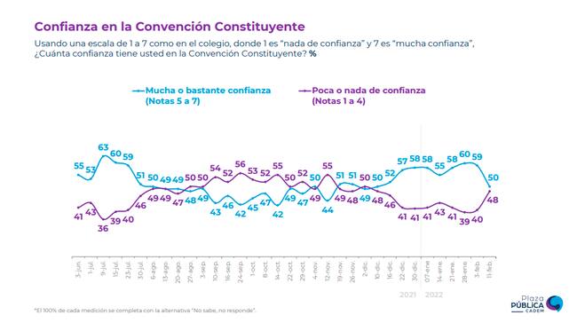Este lunes 14 de febrero se publicó la última encuesta Plaza Pública de Cadem, que arrojó una disminución en la confianza de la ciudadanía al trabajo que se encuentra realizando la Convención Constitucional.