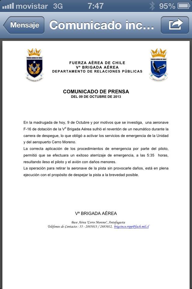Según el comunicado de prensa enviado por la Fuerza Aérea de Chile, "en la madrugada de hoy, 09 de octubre y por motivos que se investigan, una aeronave F-16 de dotación de la Va Brigada Aérea sufrió el reventón de un neumático durante la carrera de despegue, lo que obligó a activar los servicios de emergencia de la Unidad y del aeropuerto Cerro Moreno.