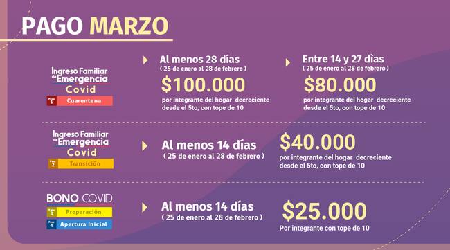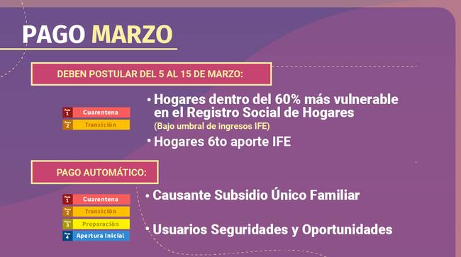 Además, el Mandatario señaló que al igual que el proceso este de febrero, quienes reciben Subsidio Único Familiar (SUF) y son parte del Sistema Seguridades y Oportunidades (SSyOO), no deberán solicitar el IFE o el Bono Covid en el sitio web, ya que recibirán de forma automática los pagos, en caso de cumplir con los requisitos.