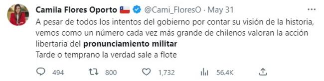 Finalmente, en dicha instancia, la diputada Camila Flores expresó que «cuando digo que me declaro agradecida del gobierno militar y que me declaro pinochetista, es porque ya me cansé de que nos cuenten la verdad de la historia a medias«.