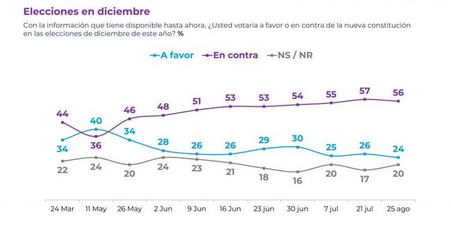 Según los datos del estudio de opinión, 24% votaría a favor, 56% votaría en contra y 20% no sabe o no responde, marcando la aprobación más baja desde que se efectúa la medición sobre este proceso.