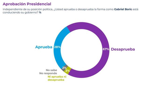 Cómo es tradicional, también se midió la percepción sobre el Presidente Gabriel Boric. En la última semana de agosto, el Mandatario marca un 28% (+1pto) de aprobación y 67% (-2pts) de desaprobación.