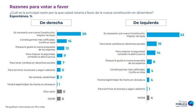 Entre las razones para rechazar la nueva propuesta por las personas identificadas como de derecha, están la preferencia por la Constitución actual (34%), como rechazo al gobierno (18%) y la falta de información (14%).