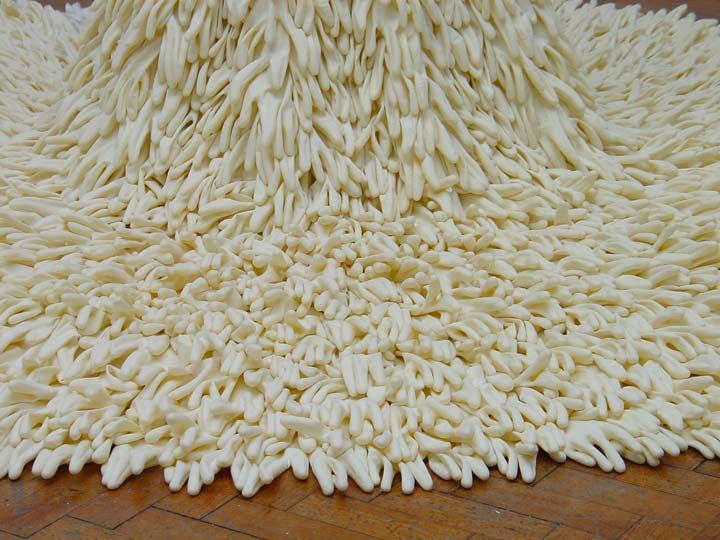 No es un vestido cualquiera, es una obra de arte diseñada por la británica Susie MacMurray y que el público pudo ver en 2004 en la galería neoyorquina Danese/Corey. El vestido, bautizado A Mixture of Frailties, está hecho con 1.400 guantes de limpieza dados vuelta que de lejos aparentan ser plumas. MacMurray es famosa por haber hecho también vestidos con globos, plumas y condones.
