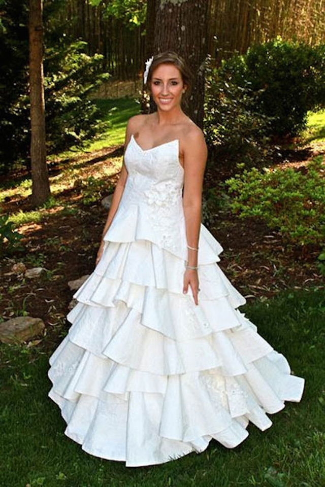Hay todo un universo de vestidos de novia hechos con papel higiénico. La empresa Cheap Chic Weddings lleva desde 2004 organizando un concurso anual de diseños hechos con ese material. Pegamento, cinta adhesiva, aguja e hilo son las herramientas que usan sus creadores para unir el material. Este vestido ganó el segundo premio del concurso de 2014: fue realizado por Katrina Chalifoux, que utilizó 28 rollos de papel higiénico y siete de doble rollo extrasuave para confeccionarlo. Aquí puedes ver más vestidos de 2014.