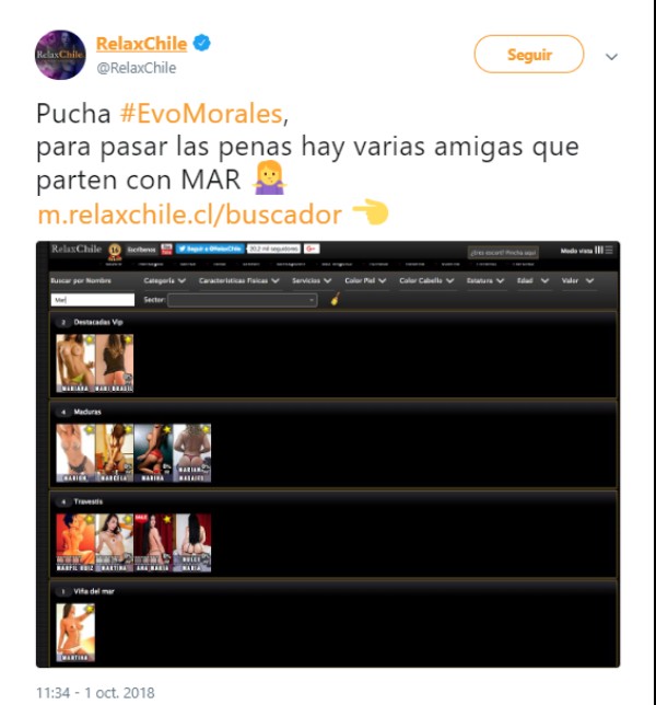 El portal de escorts Relax Chile lanzó un particular mensaje a sus miles de seguidores en Twitter, donde suele comentar actualidad y otros temas contingentes, además de ofrecer los servicios del portal.