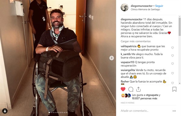 Con un sentido mensaje y una serie de imágenes que dan cuenta de sus días en la clínica Alemana, el actor Diego Muñoz fue dado de alta tras el accidente de tránsito que protagonizó en su moto el pasado 15 de marzo.
