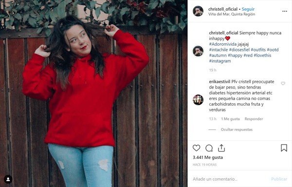 Agregando que "además, todos me dicen que yo me veo muy muy gordita, pero en verdad no soy tan rellenita, pero soy baja. Mido un metro cincuenta, por ende, cualquier kilito de más se me nota. Pero de verdad no me interesa mentir respecto a esas cosas. En serio… ya córtenla".