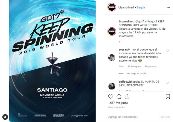 La productora de conciertos Bizarro anunció que los coreanos GOT7 se presentarán este 16 de julio en el Movistar Arena, Santiago, por su Keep Spinning 2019 World Tour.